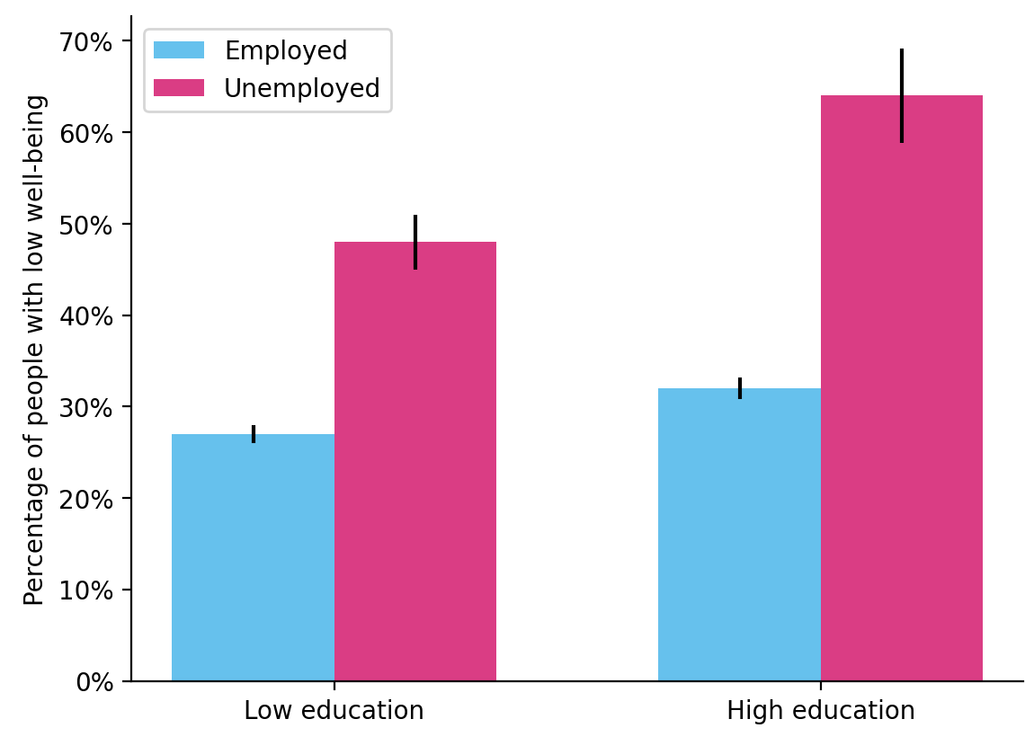 Those who think material prosperity can make up for job loss might also expect that unemployment should be harder for blue collar workers, who have less reserve wealth than white collar workers. But Clark (1994) finds the opposite. Unemployment drives a 77% increase in the rate of poor well-being for those with low education, but a 100% increase for those with high education. While this result was based on cross-sectional data, Winkelmann (1998) used panel data to show the effect was almost entirely causal. Turner (1995) replicated the effect.